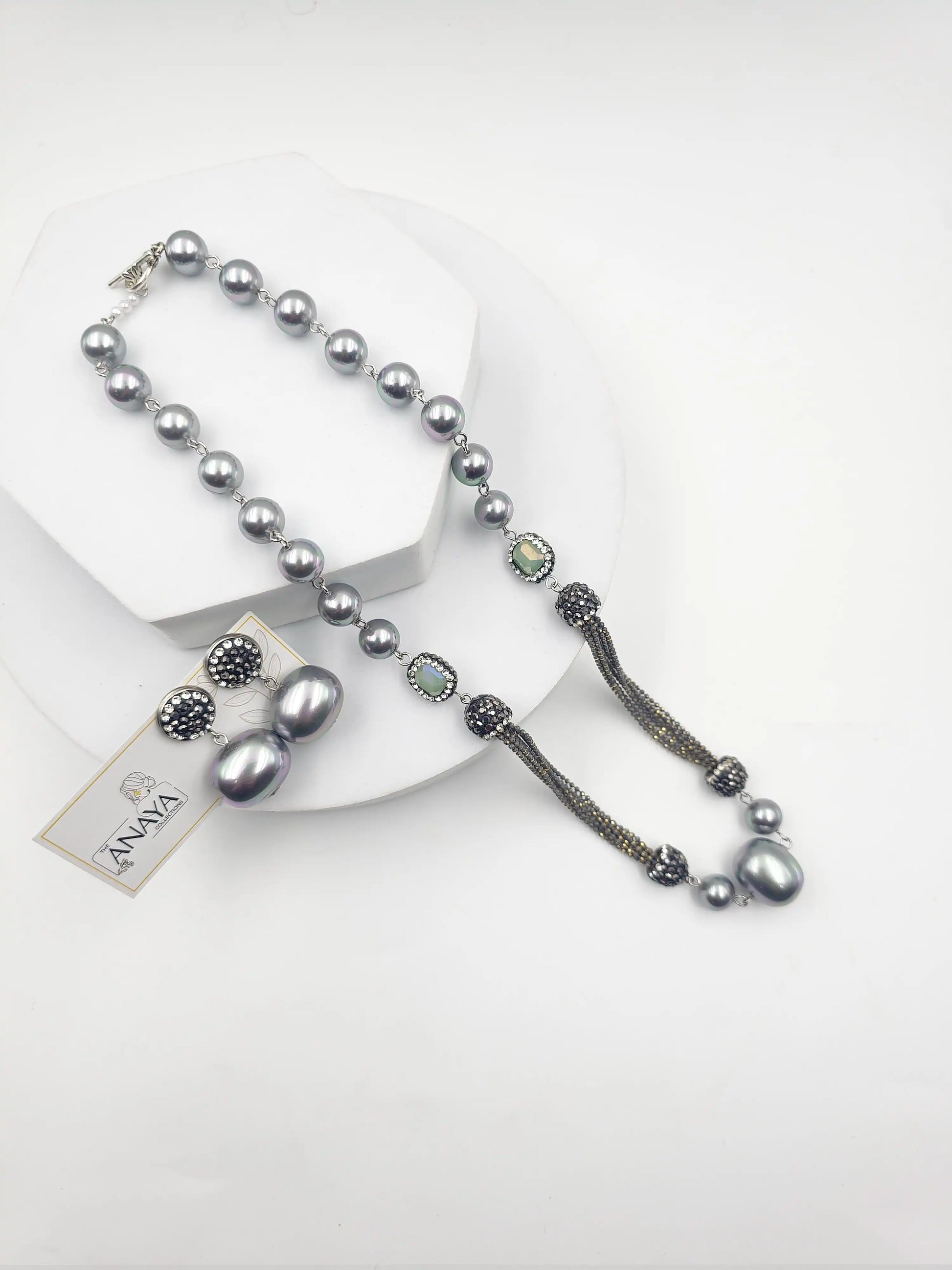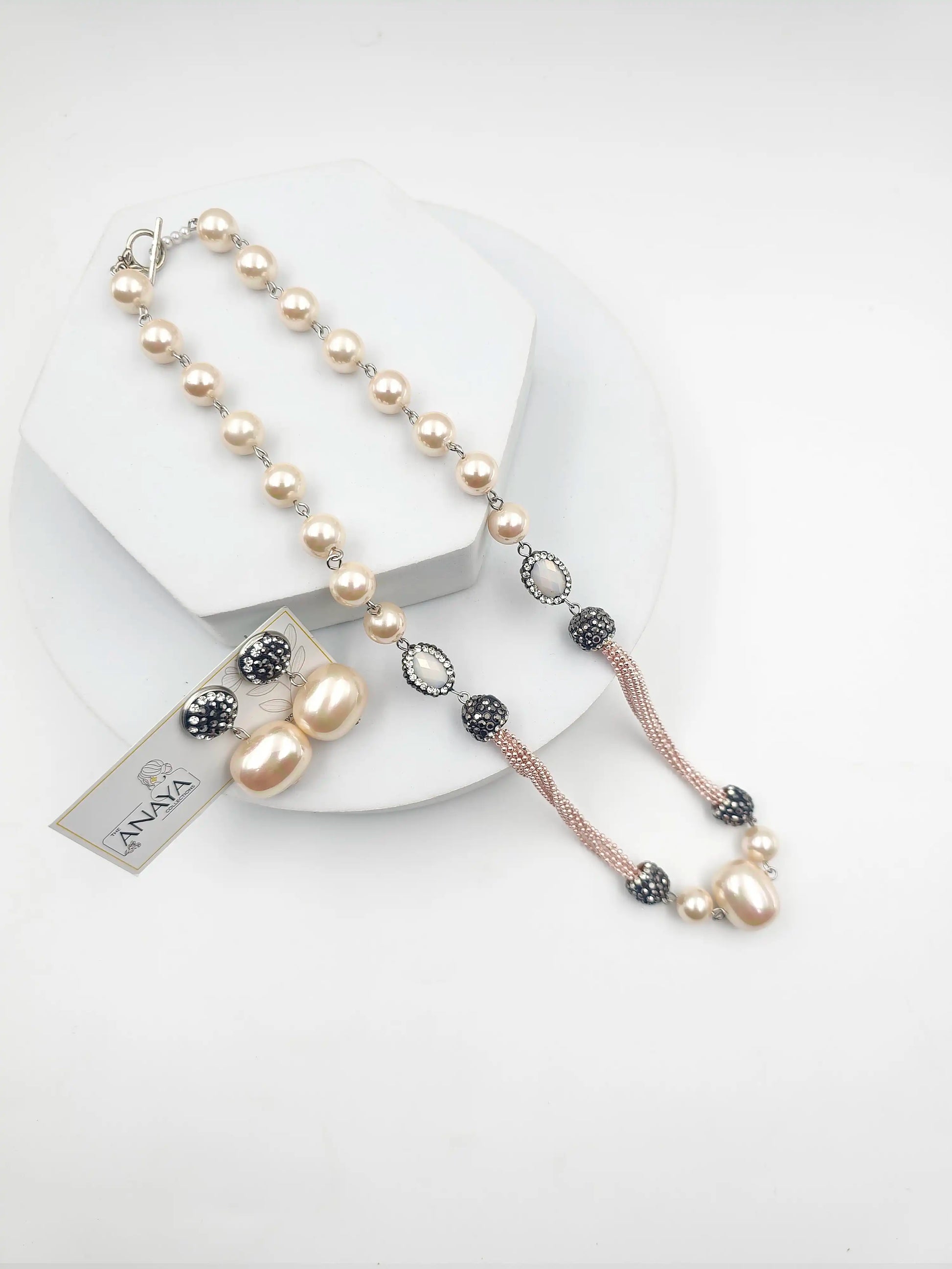 A cherismatic combination of shell pearls and marcasite beads with plated chain. Perfect for any occasion, they effortlessly add a touch of elegance to any outfit. Complete your look with these exclusive pieces and make a statement with every step.